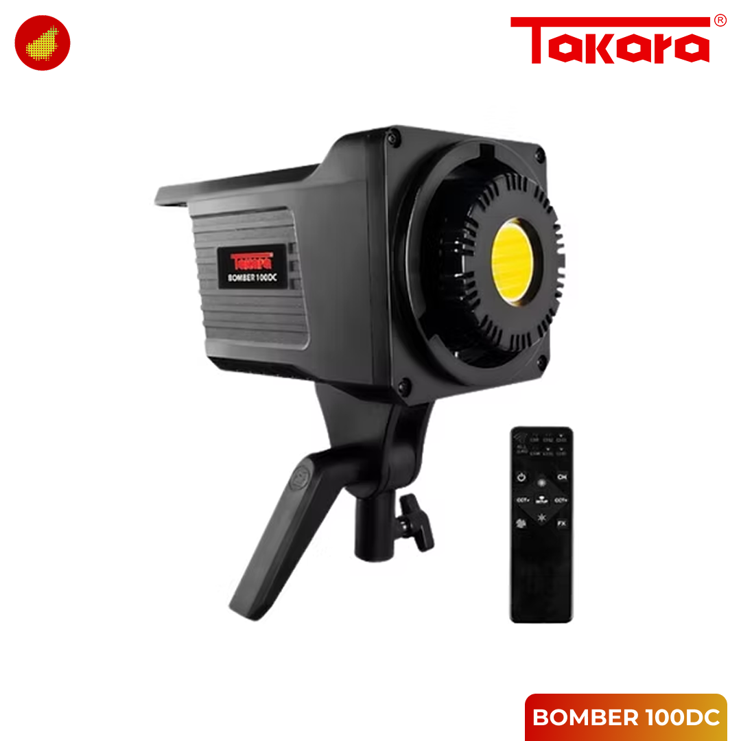 Takara Bomber 100DC adalah video light profesional berjenis COB LED (Chip-on-Board) dengan daya kuat 105W, menjadikannya pilihan pencahayaan utama untuk fotografi dan videografi. Lampu ini memiliki fitur Bi-Color yang fleksibel, memungkinkan penyesuaian suhu warna tanpa langkah (stepless) dari 3000K (hangat) hingga 6500K (dingin). Dengan kecerahan mencapai 7500 Lumen dan akurasi warna tinggi (CRI >95), Bomber 100DC menjamin kualitas cahaya yang andal untuk mencocokkan kondisi ambient atau kebutuhan ekspresi kreatif.