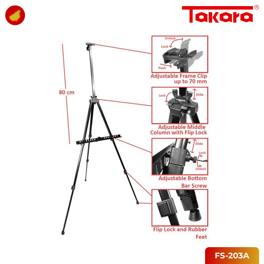 Frame stand ini sangat praktis dan portabel, terbuat dari material ringan dengan bobot hanya 850 gram dan panjang terlipat yang sangat ringkas (520 mm). Meskipun ringan, ia dapat mencapai tinggi maksimum 1600 mm dan mampu menahan beban hingga 2 kg. Kemudahan perakitan dan pembongkarannya menjadikan Takara FS-203A pilihan yang sempurna untuk kebutuhan display yang fleksibel, baik untuk penggunaan permanen maupun sementara saat pameran.