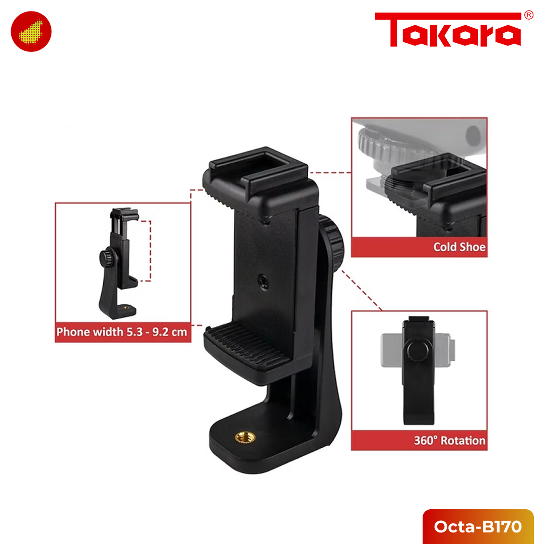 OCTA-B170 menggunakan sistem pengunci flip-lock yang cepat pada kolom utama dan memiliki drat 1/4'' universal pada kepalanya, yang kompatibel dengan berbagai aksesoris. Produk ini sudah menyertakan 360° Rotation Phone Holder yang dapat menampung smartphone dengan lebar 53 mm hingga 92 mm. Dengan beban maksimal 3 kg dan berat hanya 650 gram, tripod ini adalah solusi support yang sangat ringan, tinggi, dan fungsional untuk setup mobile Anda.