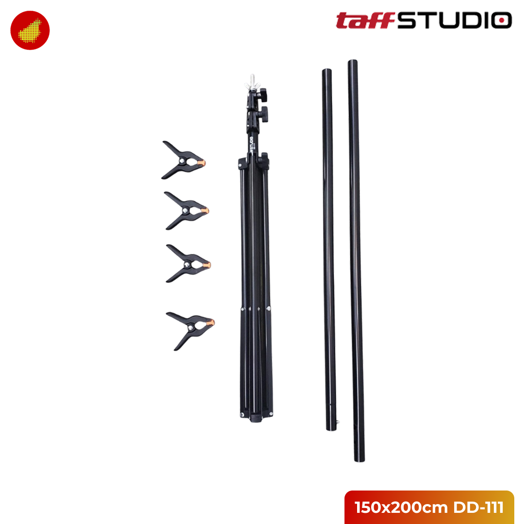 TaffSTUDIO DD-111 adalah stand backdrop berbentuk huruf "T" yang dirancang khusus untuk memudahkan pemasangan kain latar belakang bagi para fotografer, videografer, hingga content creator. Dengan desain yang simpel namun fungsional, tripod ini memiliki tiang yang ketinggiannya dapat diatur secara fleksibel hingga 2 meter. Bentuknya yang ringkas membuat tripod ini sangat cocok digunakan di ruangan terbatas maupun studio rumahan tanpa memakan banyak tempat, namun tetap memberikan hasil latar yang rapi dan profesional.